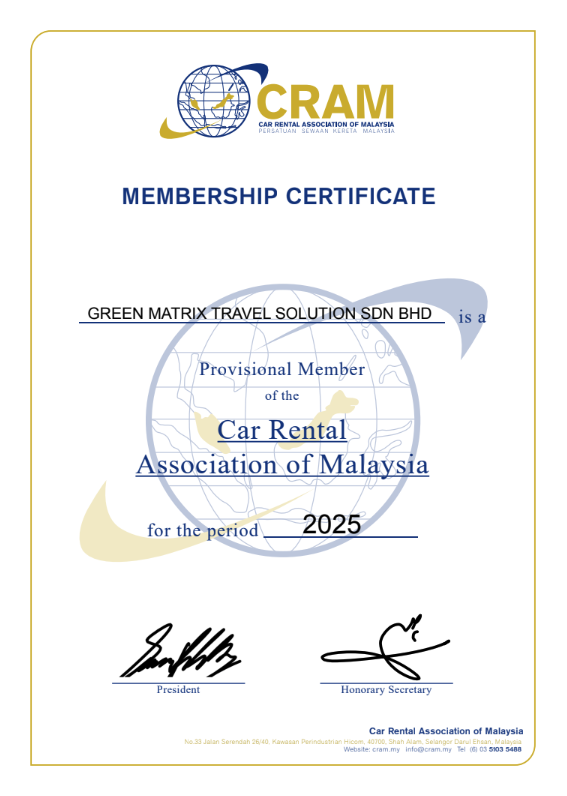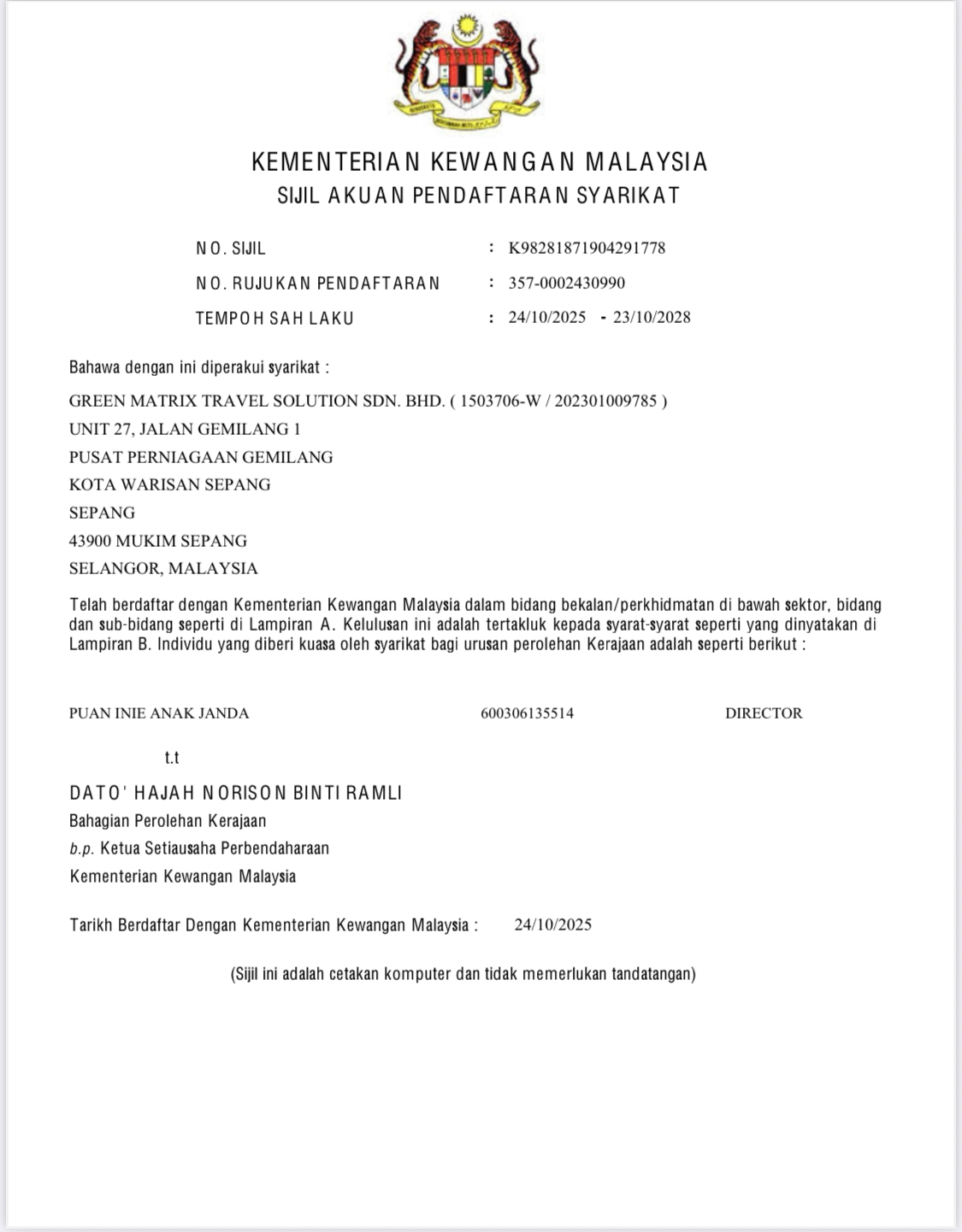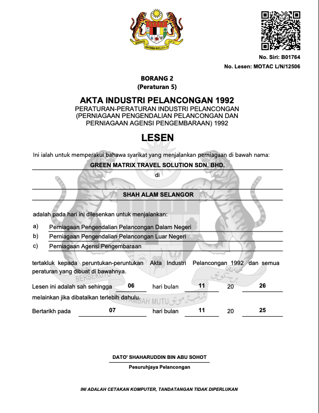 Kelulusan Permohonan Lesen Pelancongan dari Kementerian Pelancongan Malaysia.