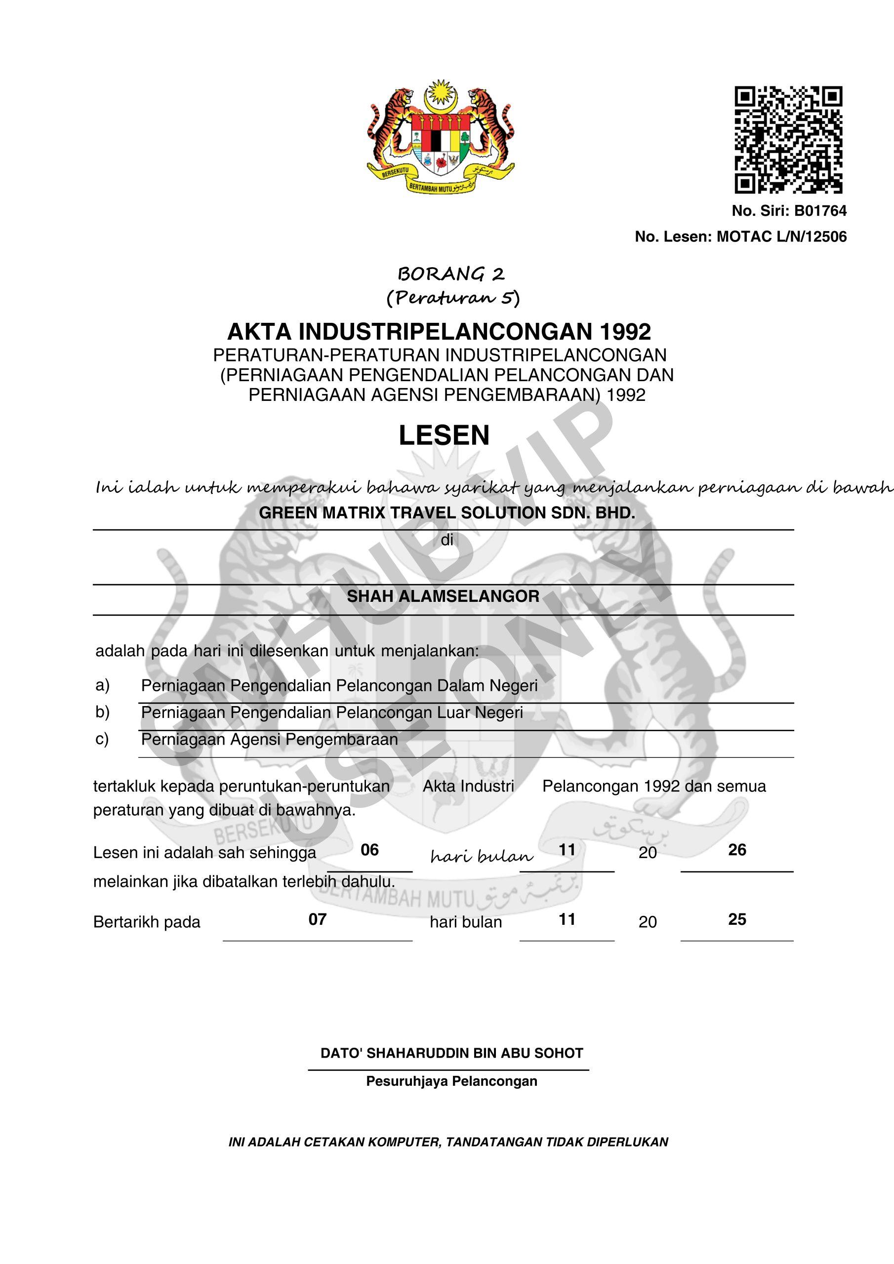 Lesen dari Kementerian Pelancongan Seni & Budaya Malaysia.